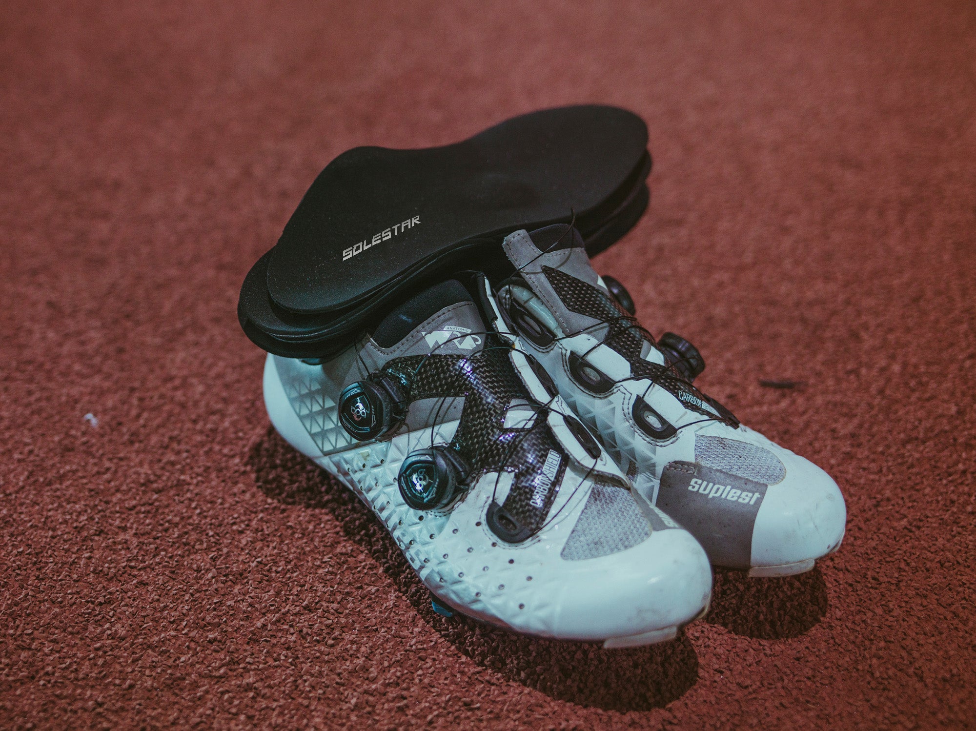SOLESTAR Einlegesohlen haben eine spezielle, patentierte Konstruktion und einen stabilen Innenkern aus Glasfaser oder Carbon. Dieser optimiert die Position des Fußes im Schuh und hält ihn dort, wo er die Kraft optimal übertragen kann. Im Profiradsport ist Solestar mittlerweile Standard, aber der Wert einer guten Einlage ist für jeden Radfahrer von großem Wert, da sie einen großen Einfluss auf die Ergonomie des Fahrers hat.